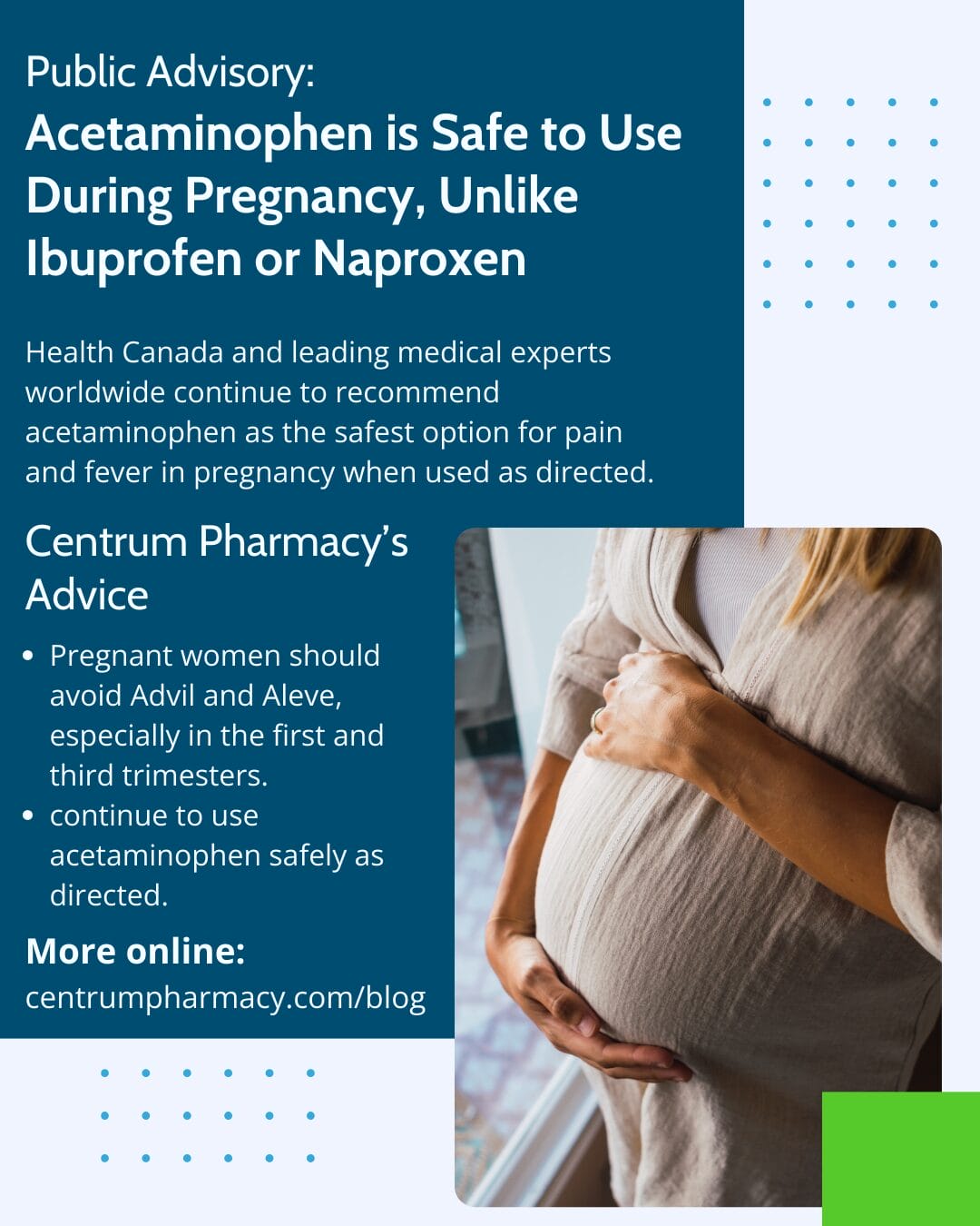 Takeaway: Pregnant women should avoid Advil and Aleve — especially in the first and third trimesters — and continue to use acetaminophen safely as directed. Your pharmacists at Centrum Pharmacy are here to support you with trusted advice.