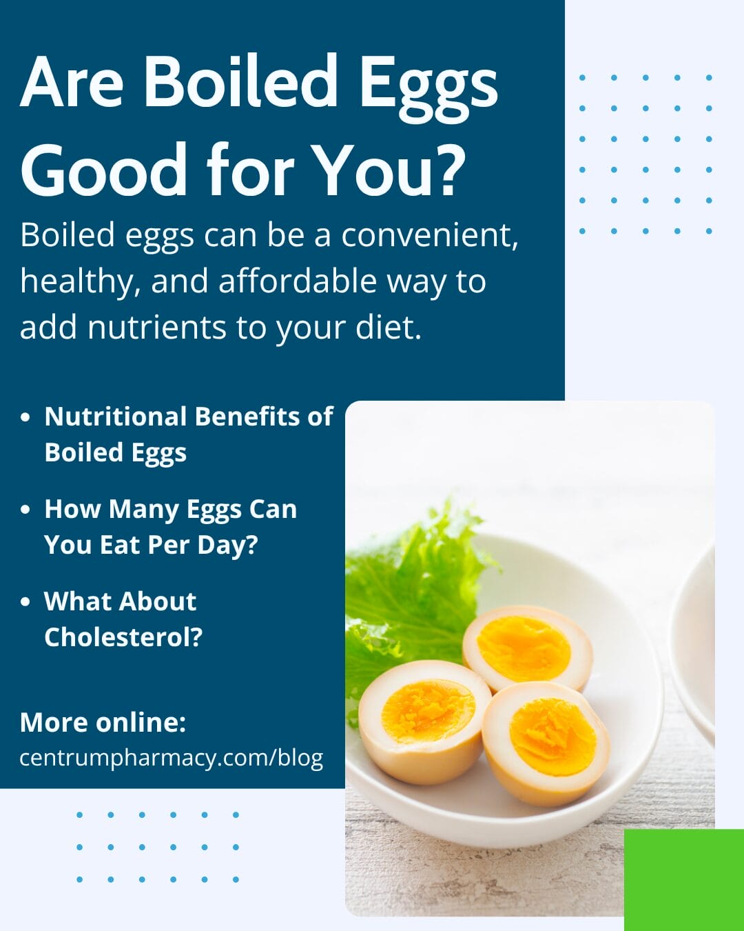Boiled eggs can be a convenient, healthy, and affordable way to add nutrients to your diet. If you have specific health conditions such as high cholesterol, diabetes, or pregnancy-related dietary needs, talk to your pharmacist or healthcare provider for personalized nutrition advice.