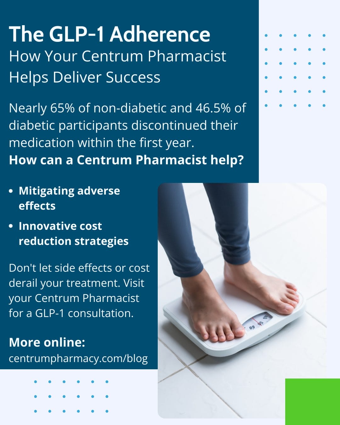 Don’t let side effects or cost derail your treatment. Visit your Centrum Pharmacist for a private, dedicated GLP-1 consultation on side effect management, cost reduction strategies, and adherence support.