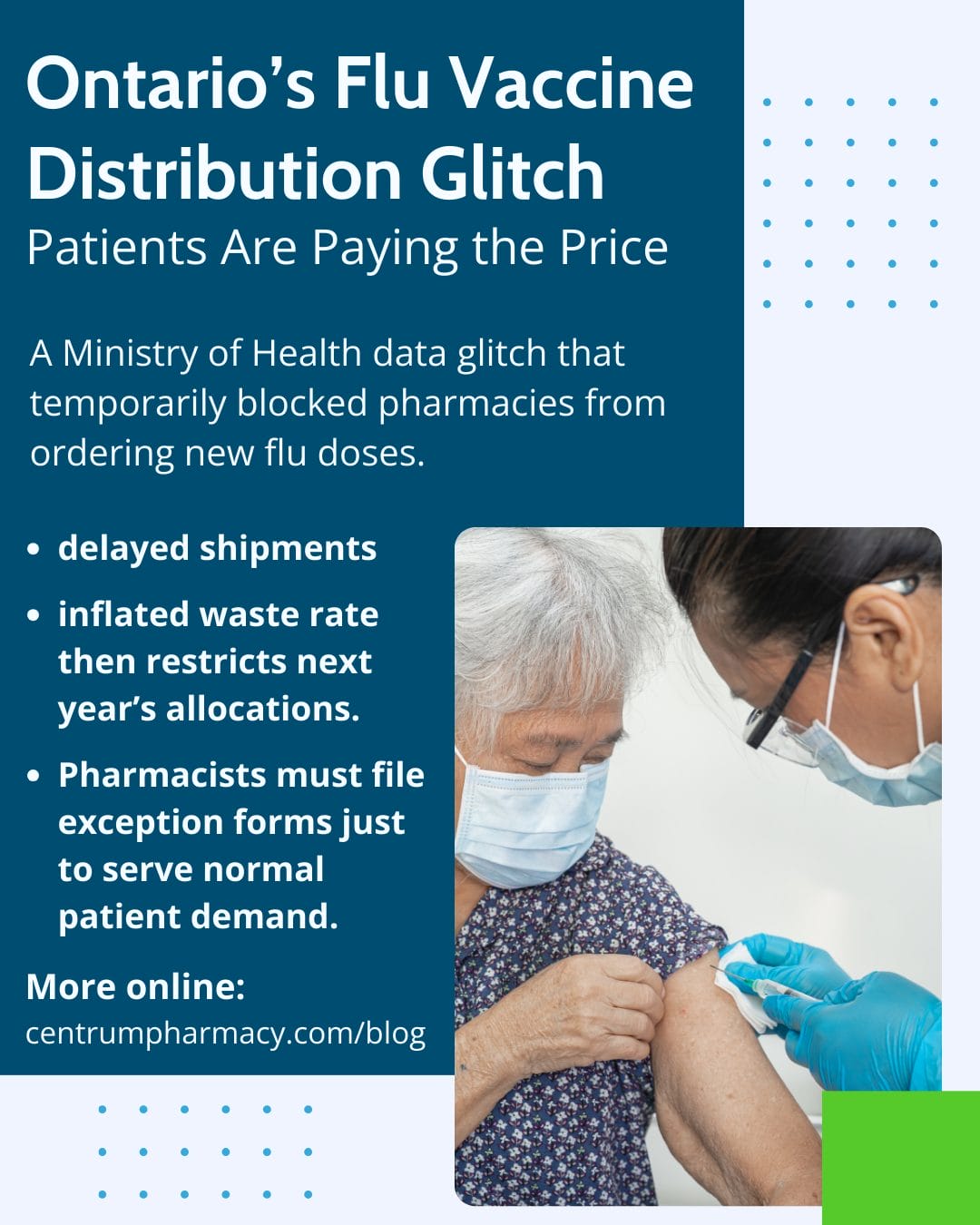A recent Toronto Star report highlighted a major issue in Ontario’s flu vaccine distribution system: a Ministry of Health data glitch that temporarily blocked pharmacies from ordering new flu doses. Although corrected quickly, the error exposed deeper flaws that pharmacists across the province—including us at Centrum Pharmacy—have been struggling with all season.